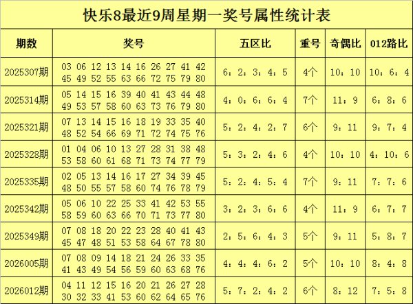福彩快乐8第2026018期开奖回顾:1112141518212223293233354041556569747578,其中奖号奇偶比为12:8,五区比为4:6:4:1:5,012路比为8:3:9,包含3个重号11、15、33。 福彩快乐8第2026012期(上周一)奖号回顾:0411121516202126272830323341536062646576,其中奖号奇偶比为8:12,五区比为5:7:2:4:2,012路比为7:5:8,包含6个重号21、26、33、41、60、......查看更多